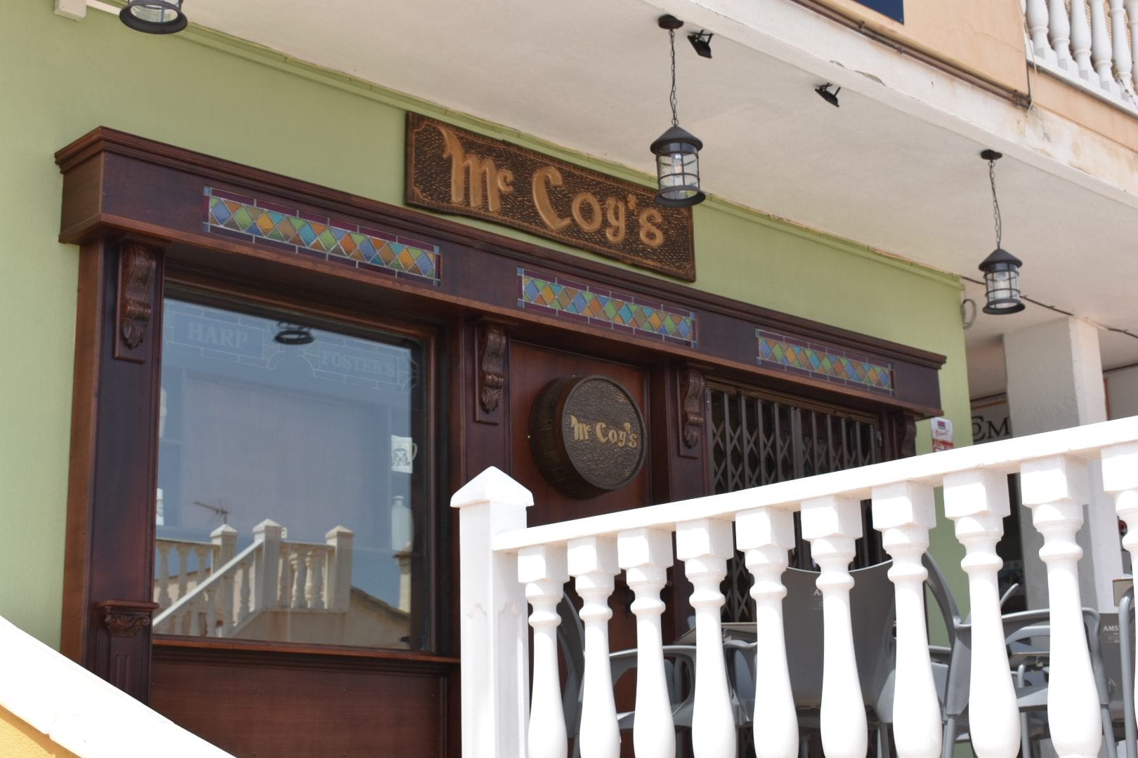 We have recently completed the fit out of Mc Coys at Playa Flamenca, Alicante, Spain. We supplied and fitted the bar complete. The shop front was designed and fitted by Used Pub and all stained glass original Irish doors also fitted with turn of the century stain glass.