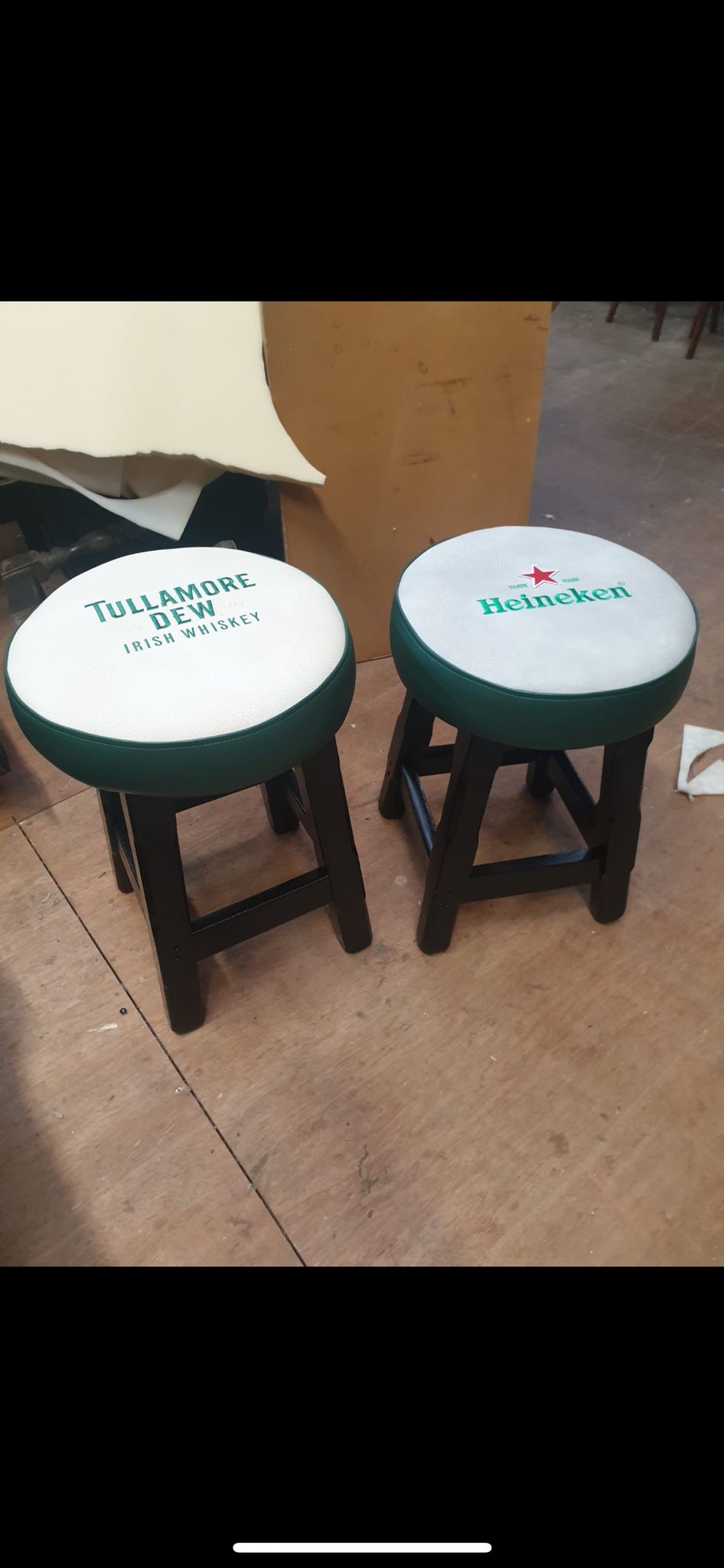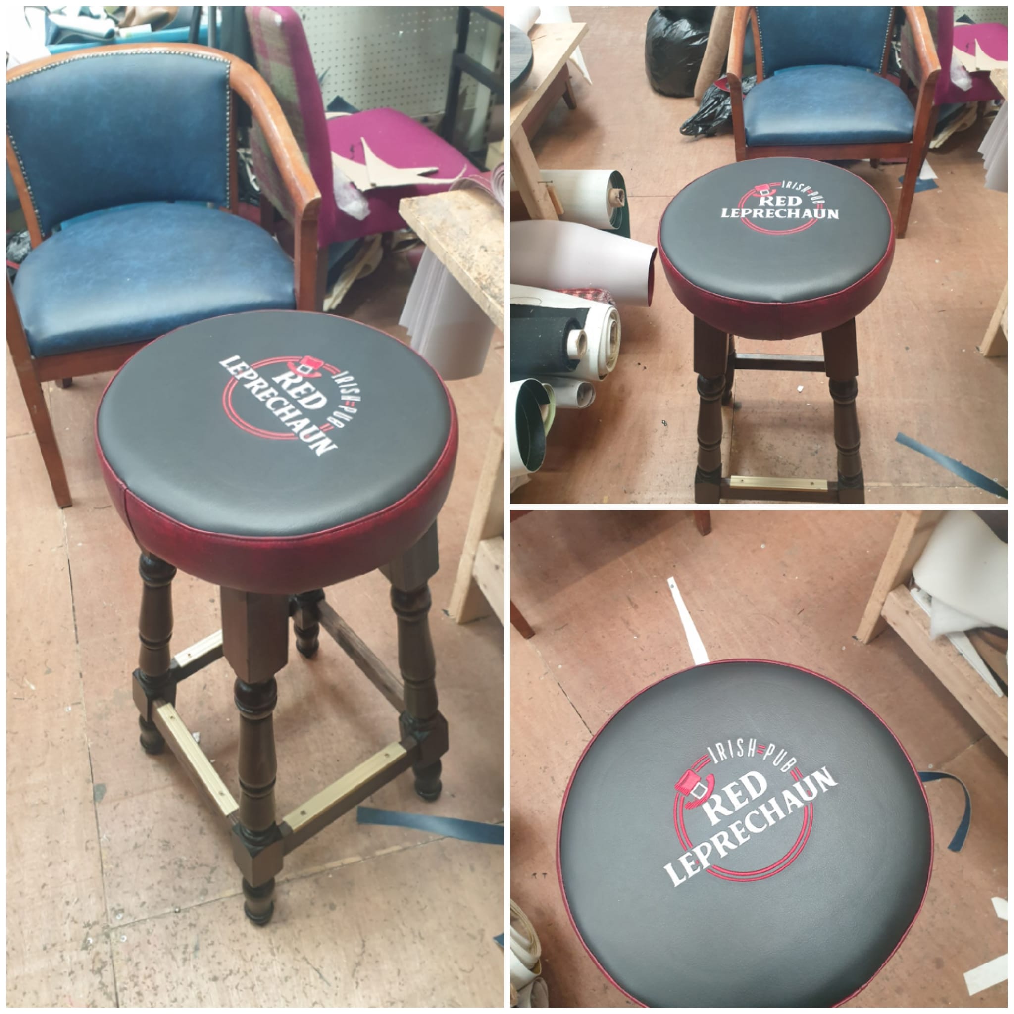 This is another of one of our recent upholstery jobs with customised logo stool tops that were shipped to The Red Leprechaun, Cincinnati, OHIO